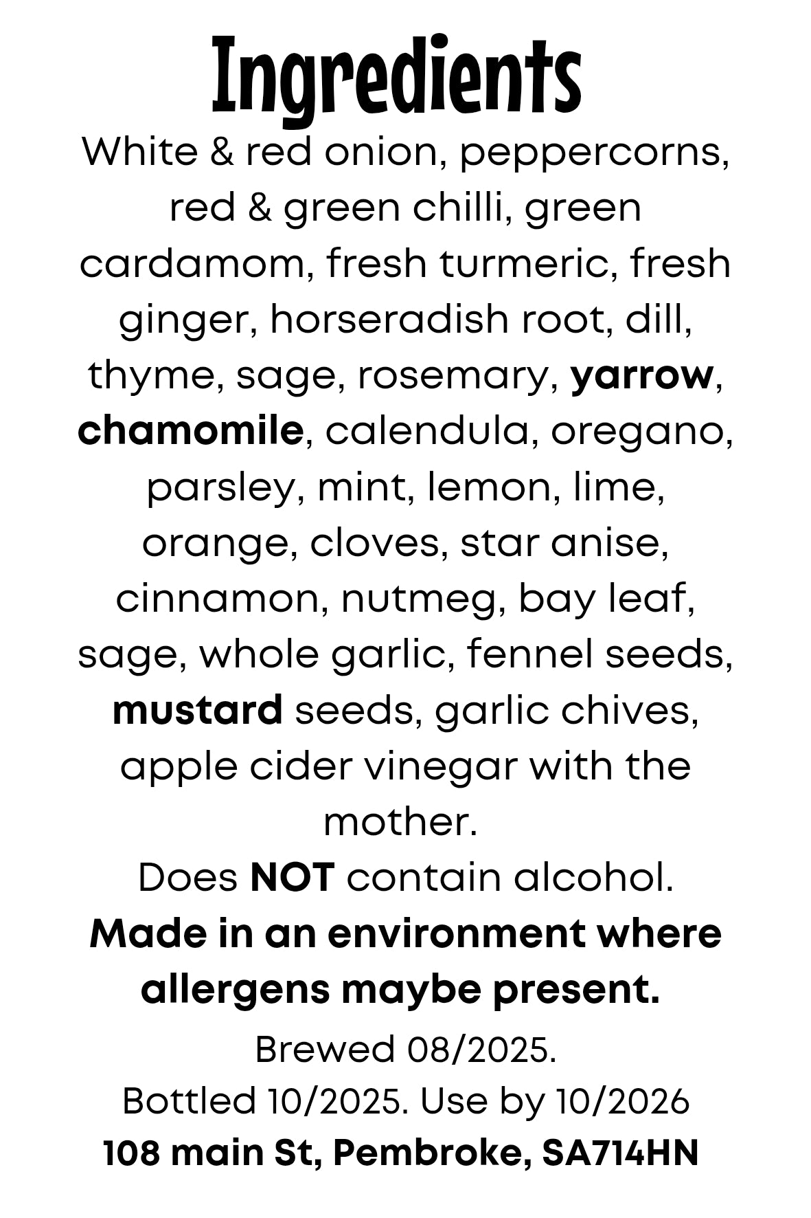 Ingredients: White & red onion, peppercorns, red & green chilli, green cardamom, fresh turmeric, fresh ginger, horseradish root, dill, thyme, sage, rosemary, yarrow, chamomile, calendula, oregano, parsley, mint, lemon, lime, orange, cloves, star anise, cinnamon, nutmeg, bay leaf, sage, whole garlic, fennel seeds, mustard seeds, garlic chives, apple cider vinegar with the mother.